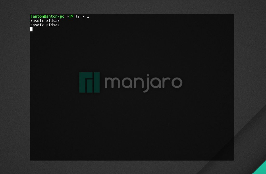 Программная утилита tr работает со стандартным вводом и выводом в Линукс. Рассмотрим на примере того, как можно поменять все x на z. Для этого необходимо ввести в терминале следующее: