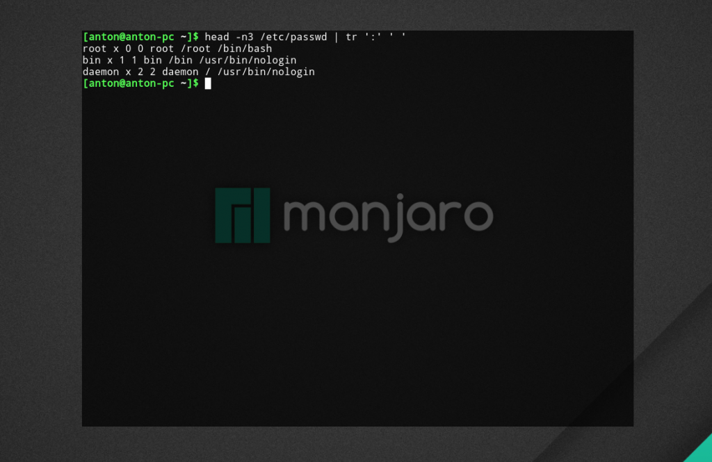 Пример 4. Вывести первые три строки файла /etc/passwd, заменив двоеточия (используемые в качестве разделителя данных) на пробелы.