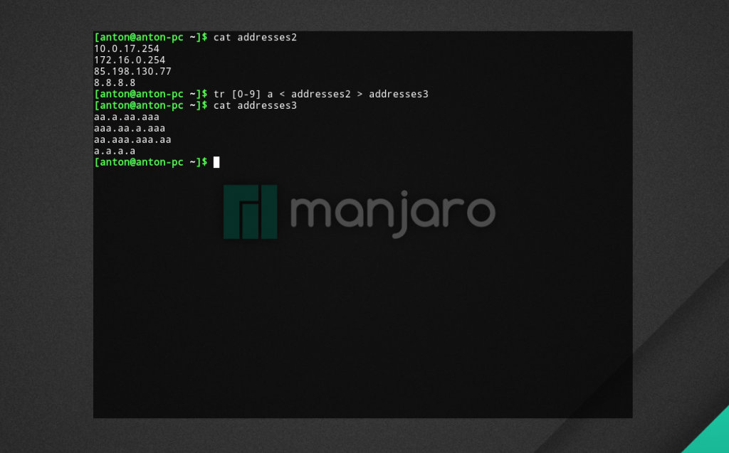 Пример 5. Заменить цифры IP-адреса файла addresses2 на буквы a, и результат записать в файл addresses3.