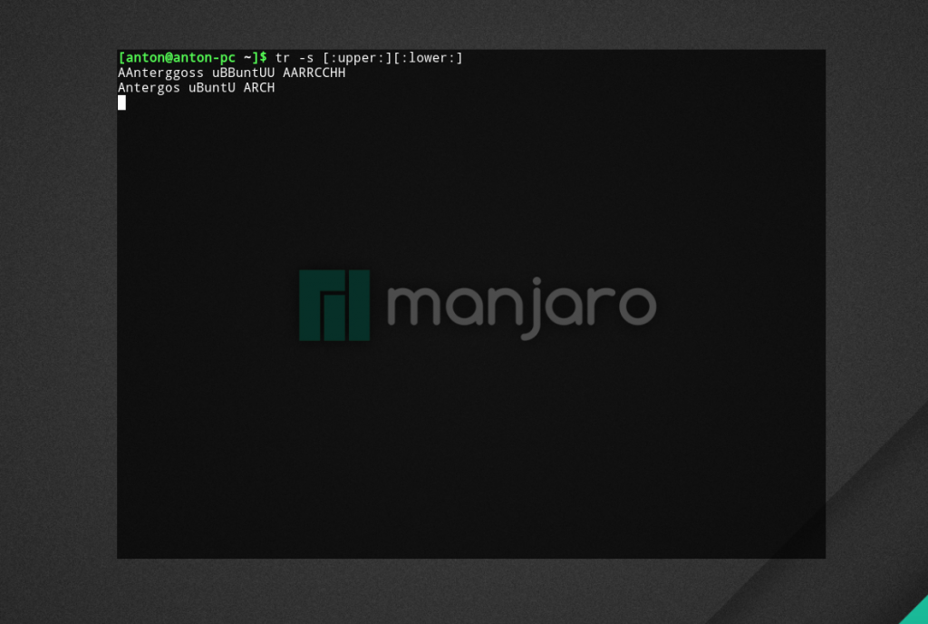 Это одна из самых полезных опций команды tr. Эта опция позволяет заменить повторяющиеся подряд символы из набора1 на единственный символ из списка2. Если список 2 отсутствует, то заменяет множественные символы одиночными. Чаще всего эта уплотняющая текст опция применяется для замены множественных пробелов на один единственный: