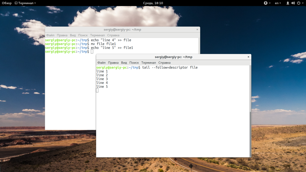 Как я говорил в начале статьи, по умолчанию опция -f или —follow отслеживает файл по его имени, но вы можете включить режим отслеживания по дескриптору файла, тогда даже если имя измениться, вы будете получать всю информацию: