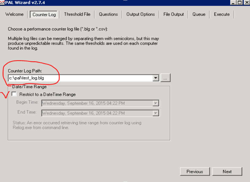 На вкладке Counter Log задаётся путь к файлу данных со счетчиками производительности, собранными ранее.