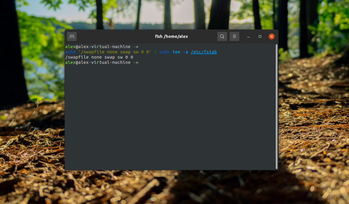 echo ‘/swapfile none swap sw 0 0’ | sudo tee -a /etc/fstab