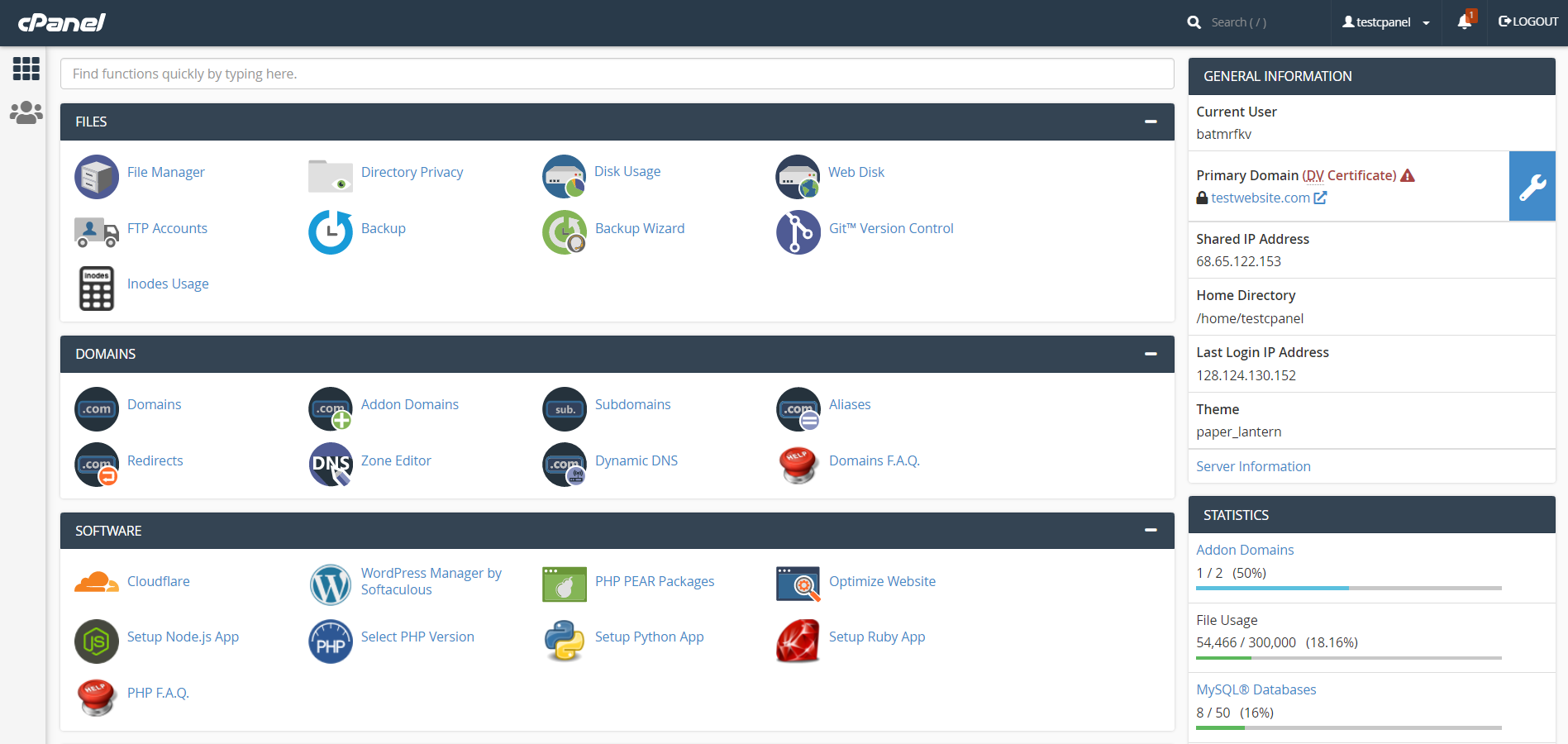 Различные установки cPanel включают в себя различные функции, но хорошей новостью является то, что довольно легко просматривать и узнавать каждый раздел. При первом входе в систему вы обычно увидите некоторые показатели, которые регистрируют использование ресурсов (например, использование вашего ЦП, доступное дисковое пространство и использование вашей памяти). Эти показатели могут позволить вам следить за общей эффективностью вашего сайта.