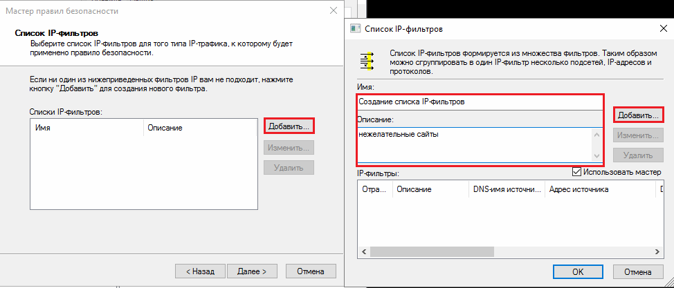 Следующее окно пропустим. После него нам предстоит указать IP, подлежащий блокировке. Отметим в нижней части окна «Область» пункт «Указанные IP-адреса» и нажмем «Добавить». Верхнее поле не трогаем, так как оно предназначено для создания правил в локальных сетях.