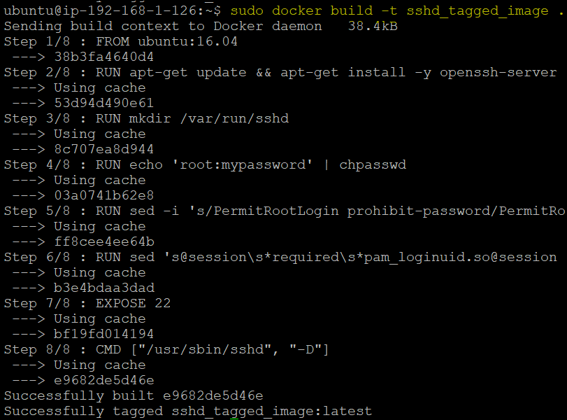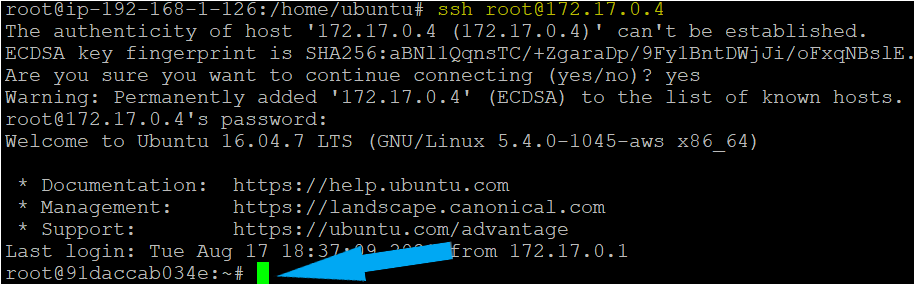 4. Finally, run , as shown below, to SSH into the running container called . In the below code snippet: