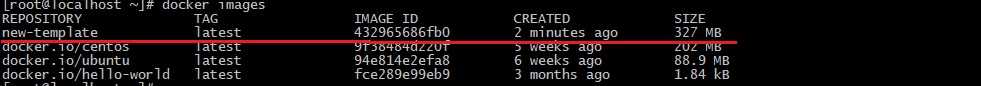 Где идентификатор – это тот идентификатор, который использовался для первоначального запуска, а new-template – назначенное нами имя нового образа. Теперь он будет виден, если выполнить команду docker images: