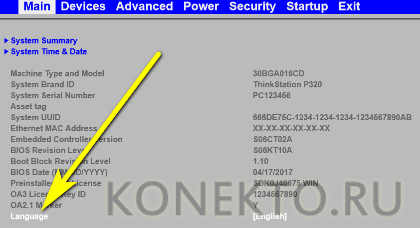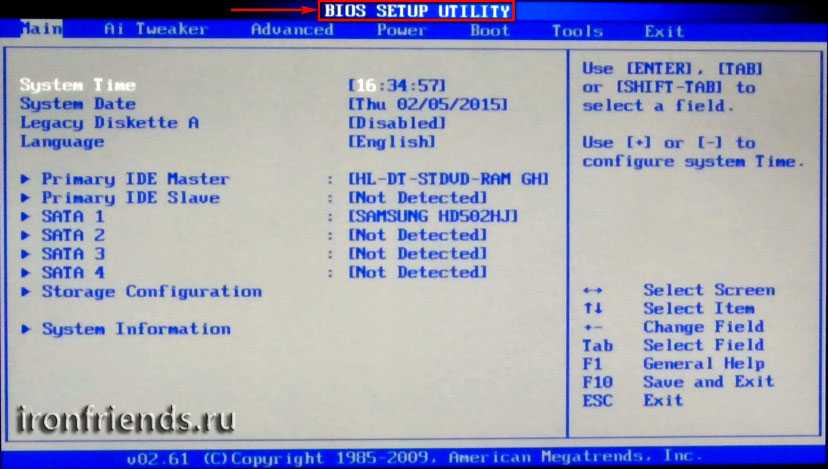 На вкладке Main юзеру доступны следующие манипуляции с BIOS: