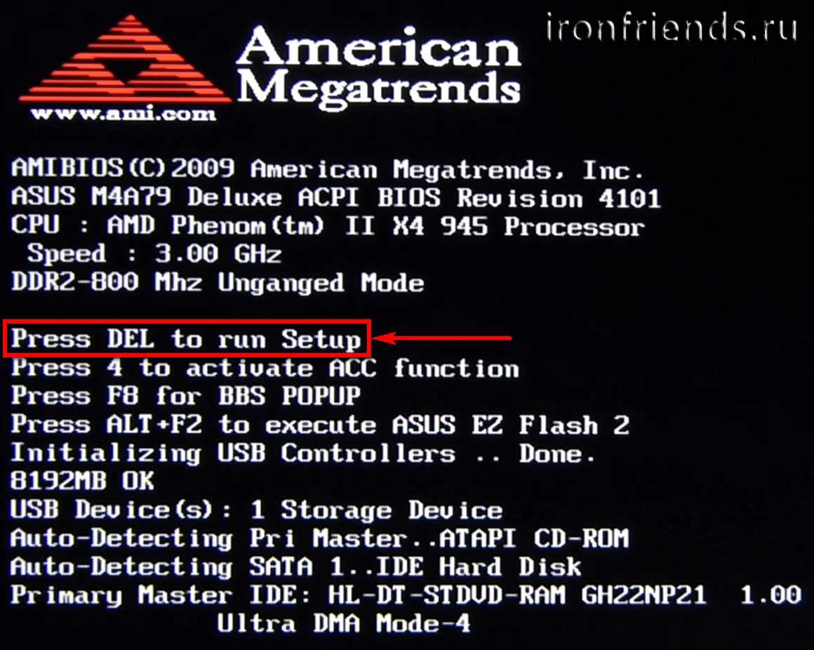Для входа в этот режим настроек необходимо после включения компьютера подождать одиночный звуковой сигнал или начало надписи о загрузке, а затем несколько раз нажать кнопку «F2» или «DEL (Delete)» (зависит от «материнки»). Правильный вариант высвечивается внизу экрана.