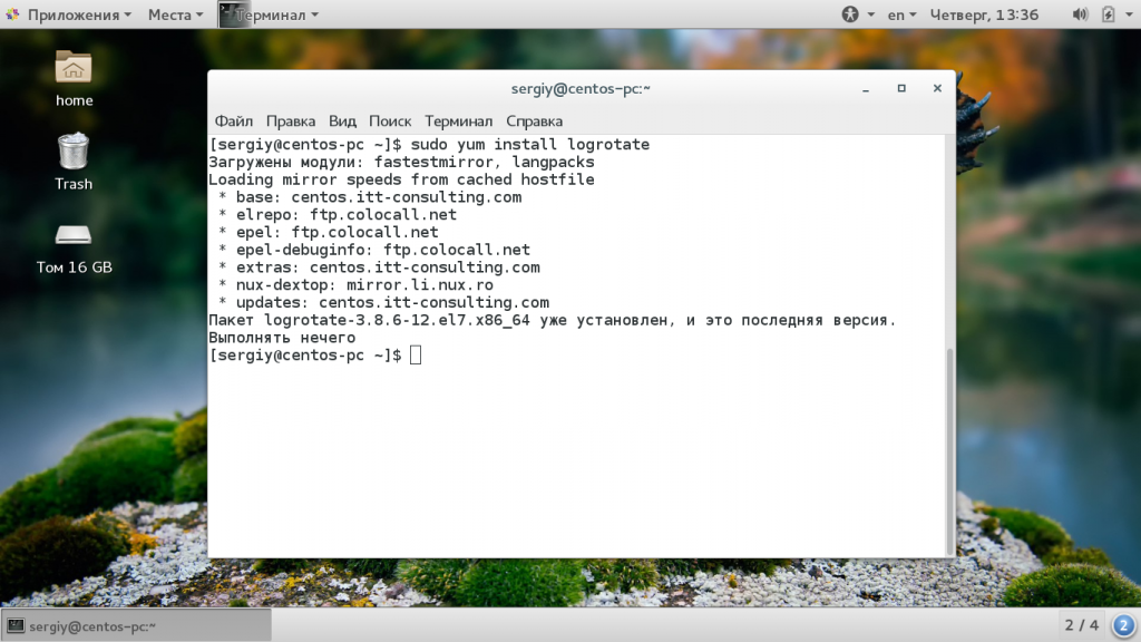 Logrotate — это популярная утилита, поэтому в большинстве дистрибутивов она поставляется по умолчанию. Вы можете убедиться, что программа установлена в вашем дистрибутиве, попытавшись ее установить. Например, в CentOS: