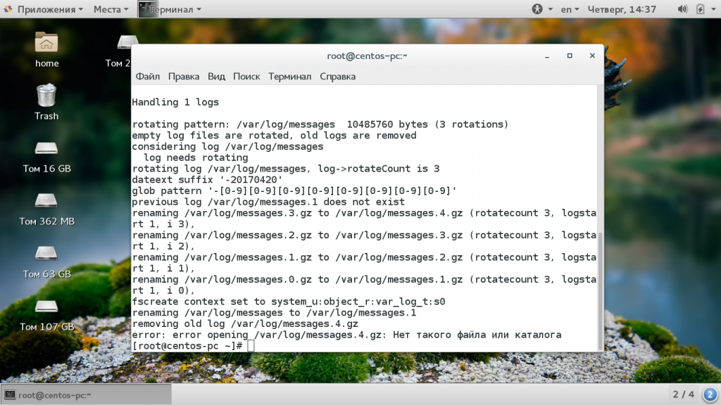 Теперь осталось протестировать как работает наша конфигурация. Для этого запустим утилиту logrotate с опцией -d. Она выведет все, что планируется сделать, но не будет изменять файлы на диске. У нас есть файл /var/log/messages, размером 40 Мегабайт, посмотрим что будет делать утилита: