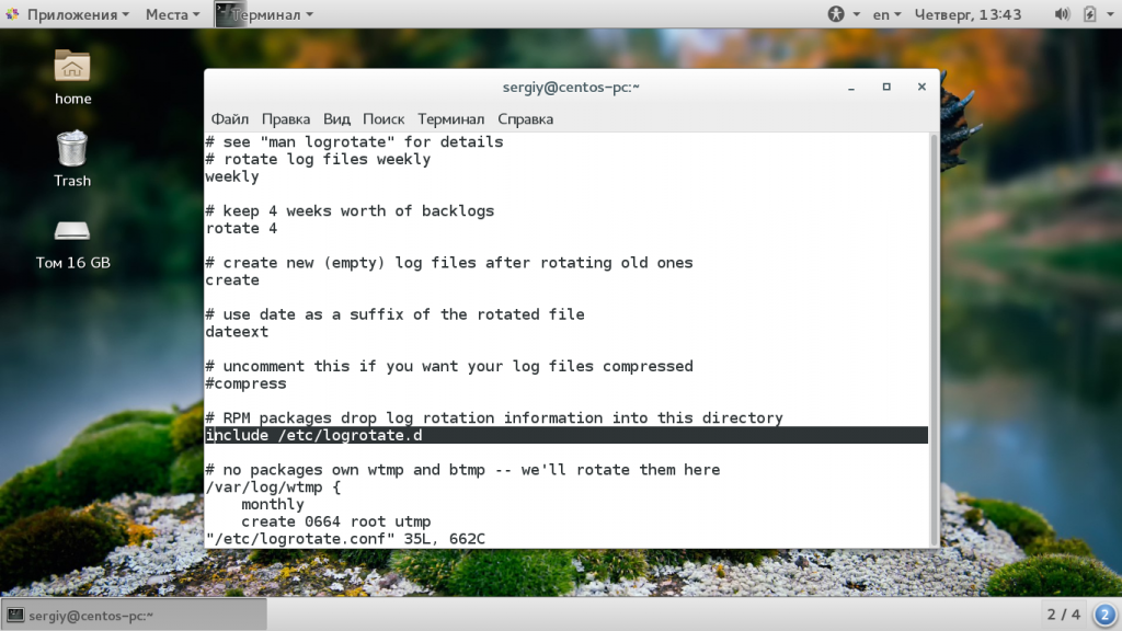 - /etc/logrotate.conf: этот файл содержит некоторые настройки по умолчанию и устанавливает ротацию нескольких логов, которые не принадлежат никаким системным пакетам. Он также использует оператор include для загрузки конфигурации из каталога /etc/logrotate.d.