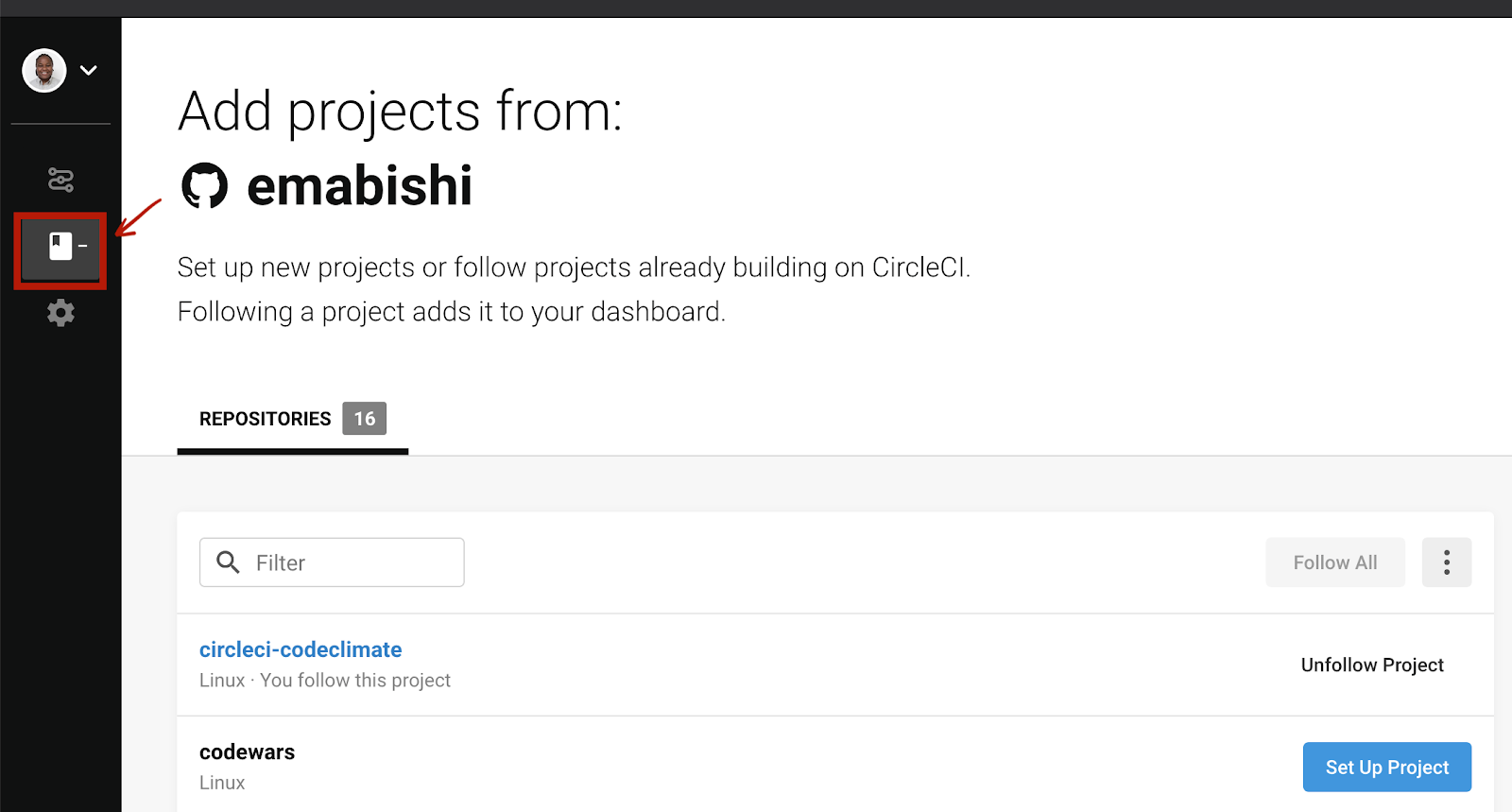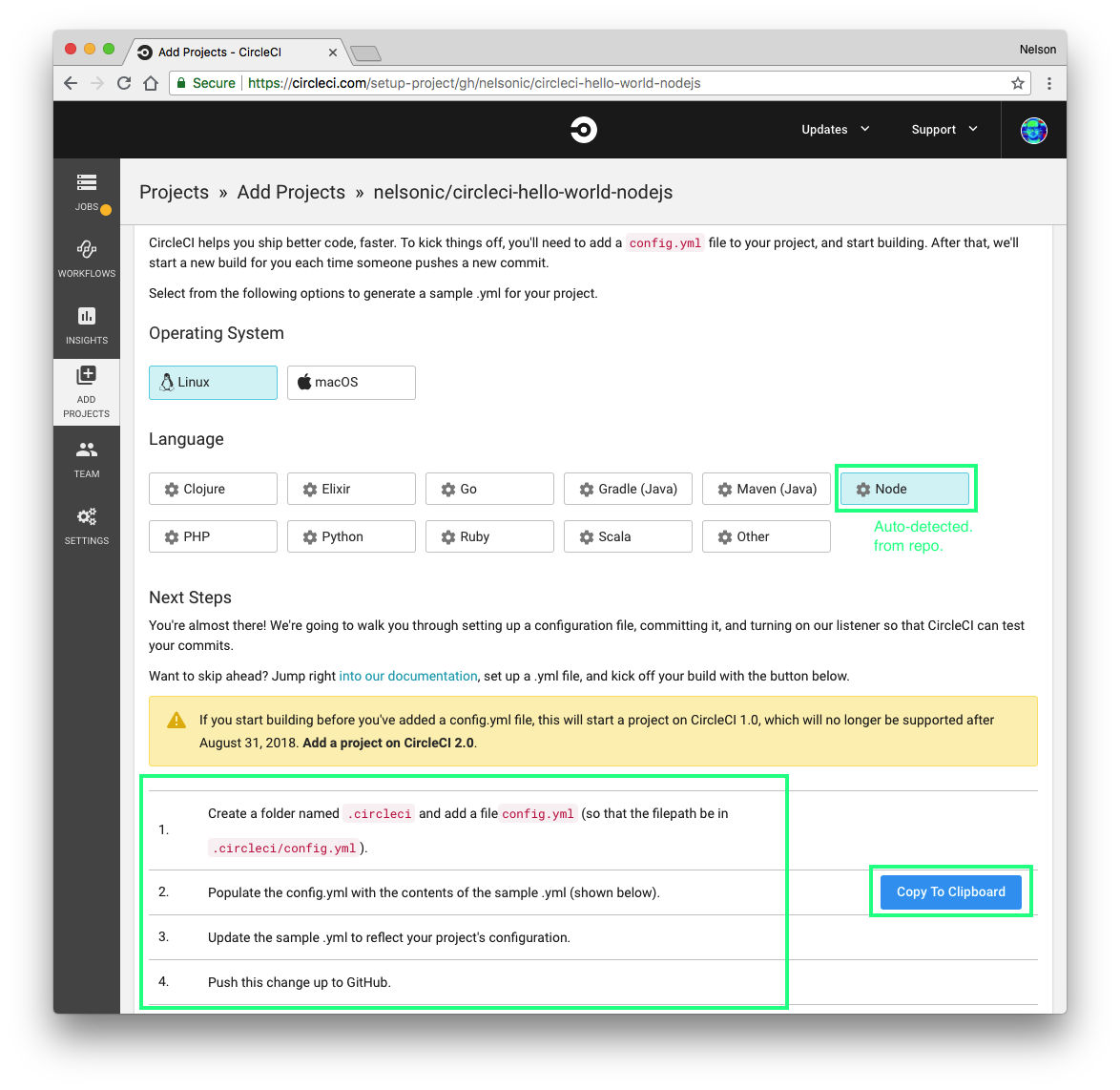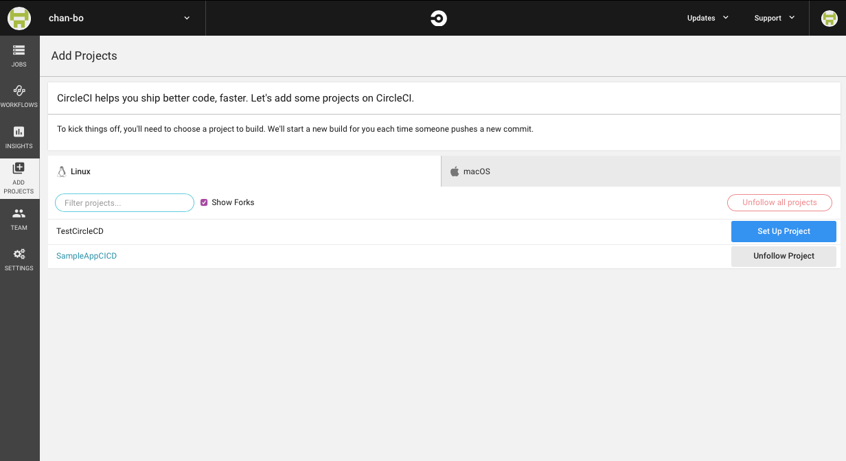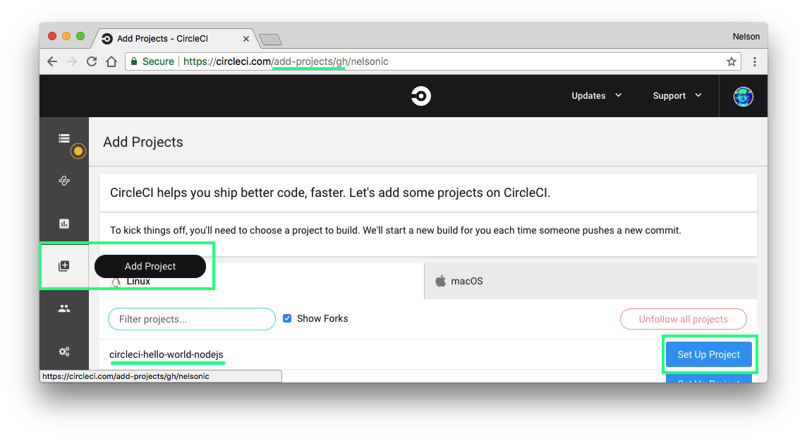 - Go to CircleCI Website > Go to app > On the left side choose ADD PROJECTS > Browse your project > Set Up Project