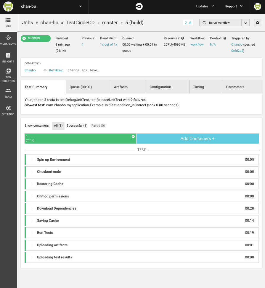 5. After finish your build, you can see the result like Test Summary, Artifacts, and your Configuration as below: