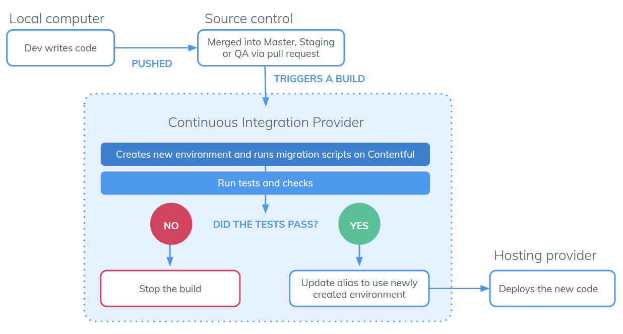 Like handling changes to a database, integrating Contentful into a continuous integration (CI) pipeline enables changes to a content model and migrating data as part of a deployment process. Further, it enables testing content changes and canceling a deploy process thereby preventing interruptions or downtime, in case the tests fail.