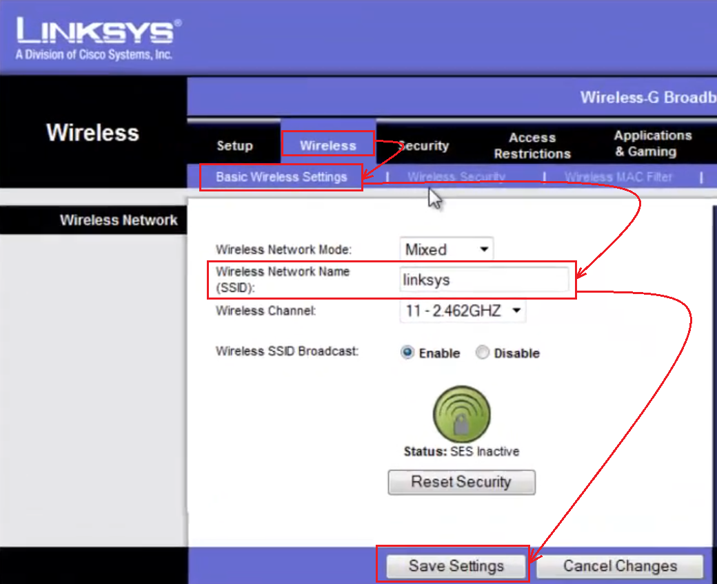 Для начала перейдем во вкладку «Wireless» и для выберем пункт «Basic Wireless Settings». Здесь мы зададим имя нашей вай фай сети, в пункте «Wireless Network Name», оно может быть любым (конечно латинскими буквами), его вы будете видеть при поиске доступных сетей. Затем жмем на кнопку Save Settings.