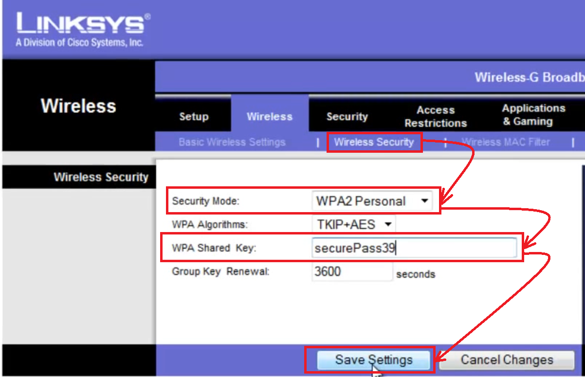 После того как мы задали имя сети следует её запаролить. Для этого перейдем в раздел «Wireless Security». В поле «Security Mode» выбираем «WPA2 Personal»(это самый безопасный тип шифрования). В поле «WPA Shared Key» задаем пароль WiFi сети на латинской раскладке и не меньше 8 символов. После этого жмем на кнопку Save Settings.