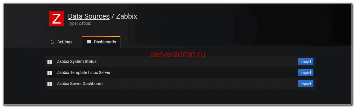 В комплекте плагина alexanderzobnin-zabbix-app есть несколько примеров дашбордов, но из коробки они не везде работают. Надо допиливать под конкретные версии серверов, так как время от времени шаблоны меняются. Для того, чтобы посмотреть готовые дашборды, надо вернуться в Data Source и перейти на вкладку Dashboards.
