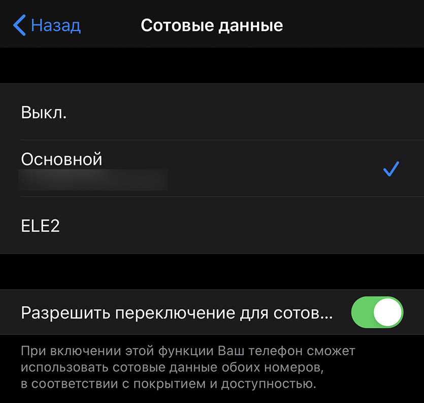 Можно вручную поменять SIM-карту для мобильных данных, но это минимум пять тапов по айфону и ещё столько же для смены карты обратно. Само переключение тоже не мгновенное. Так что быстро прыгать с одного интернета на другой не получится.