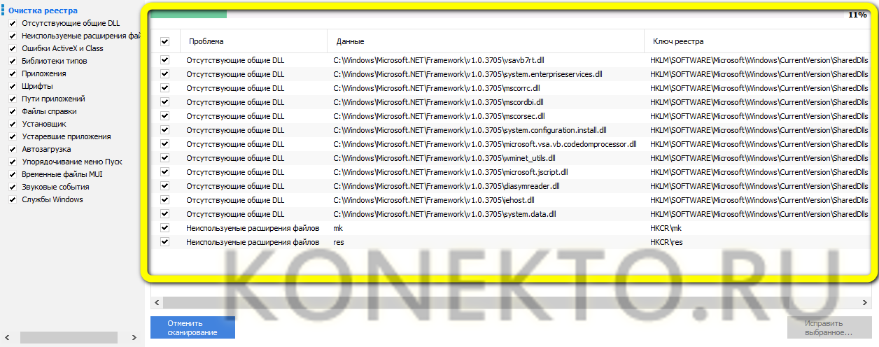 Подождать, пока приложение выявит небезопасные и лишние записи в реестре.