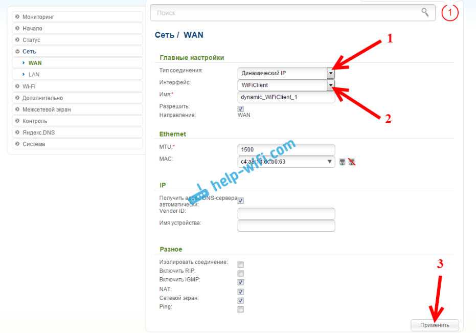 Затем, нажмите на кнопку Добавить, выберите в списке Динамический IP. В поле Интерфейс выберите пункт WiFiClient, и нажмите на кнопку Применить.