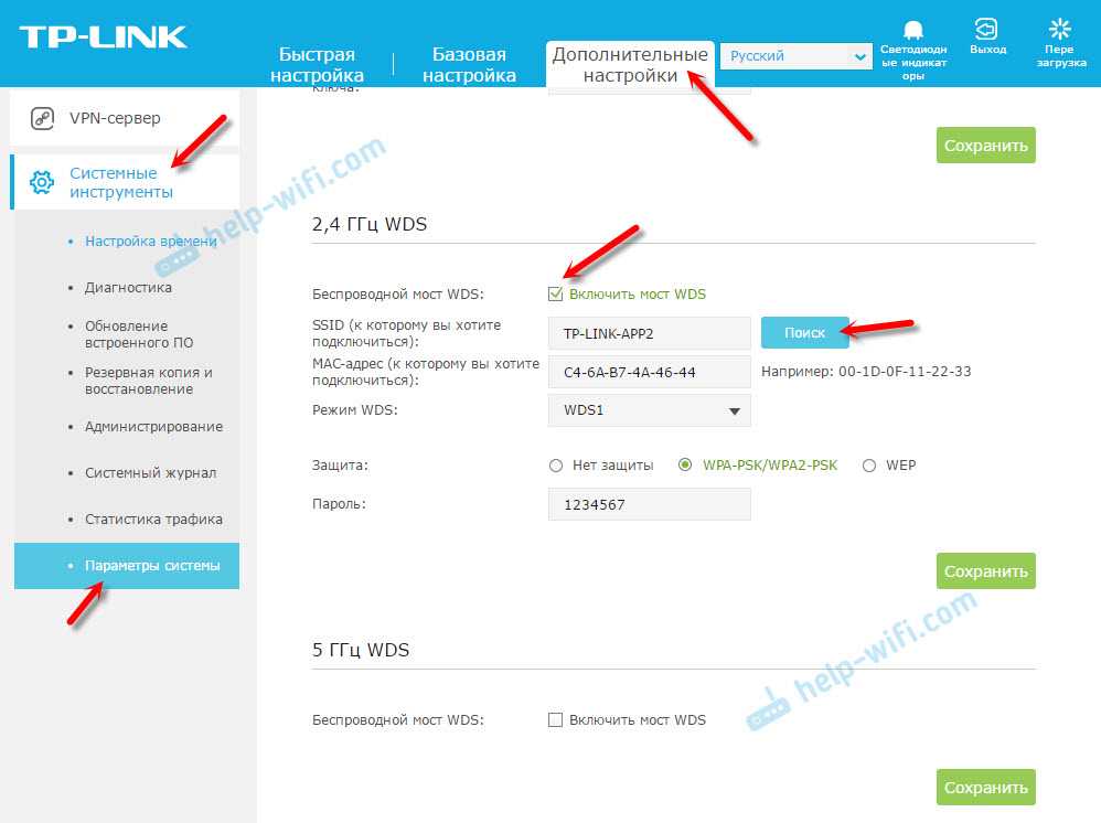 Если у вас маршрутизатор с новой панелью управления, то необходимо перейти в раздел «Дополнительные настройки» – «Системные инструменты» – «Параметры системы». Если у вас роутер двухдиапазонный, то там вы увидите возможность настроить режим моста в двух диапазонах. На частоте 2,4 GHz и 5 GHz.