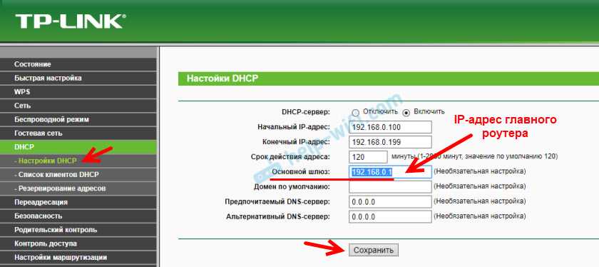 Обновление. Еще одно решение проблемы, когда соединение по WDS установлено, но доступа к интернету нет. В настройках DHCP-сервера на роутере? который мы настраиваем в режиме WDS нужно в качестве «Основной шлюз» (Default Gateway) прописать LAN IP-адрес главного роутера.