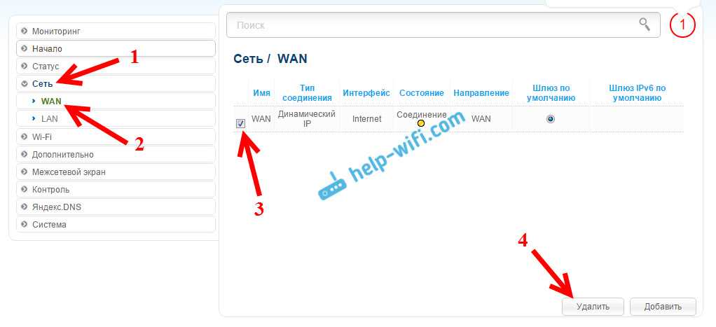 - Во вкладке «Сеть» выбрать подпункт с названием WAN и перейти по нему, после чего удалить все ранее установленные профили подключения.