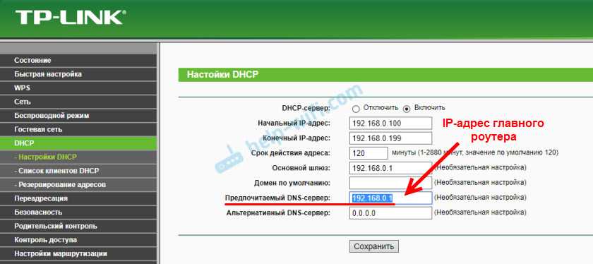 Если не поможет – попробуйте IP-адрес главного роутера прописать еще в качестве DNS-сервера.