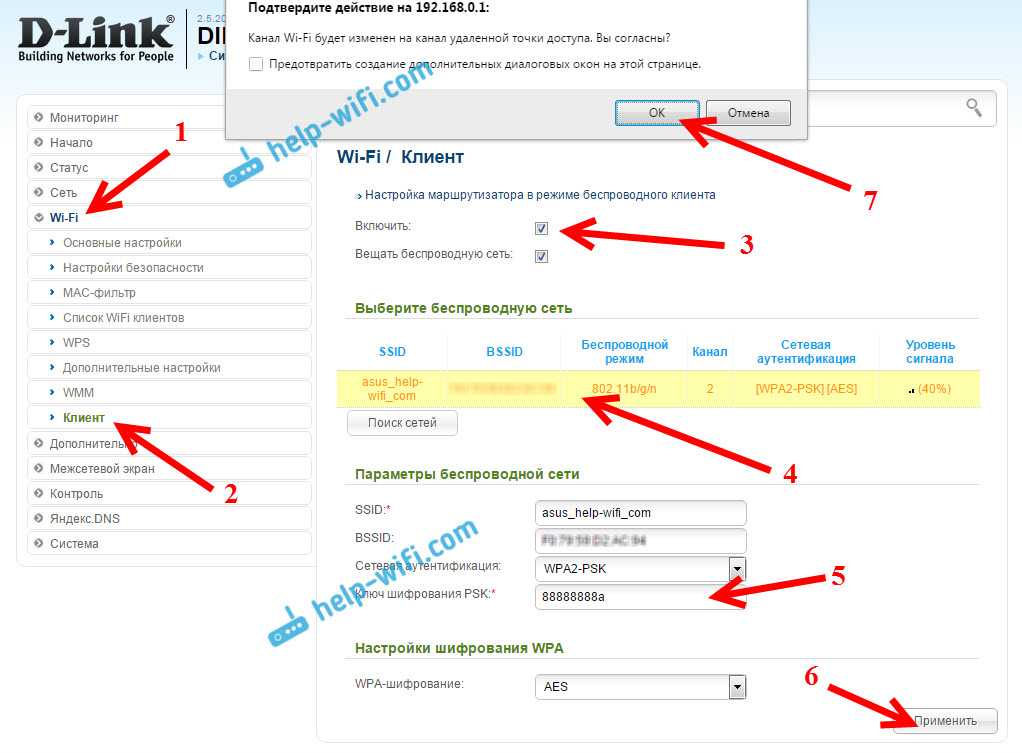 Для начала, подключаемся к нашему D-Link по кабелю, и заходим в настройки по адресу 192.168.0.1. Переходим сразу на вкладку Wi-Fi — Клиент. Ставим галочку возле Включить, в списке сетей выбираем свою сеть (главного роутера), в поле WPA-шифрование укажите пароль от вашей сети и нажмите на кнопку Применить. А если появится еще сообщение о смене канала, то нажмите Ok.
