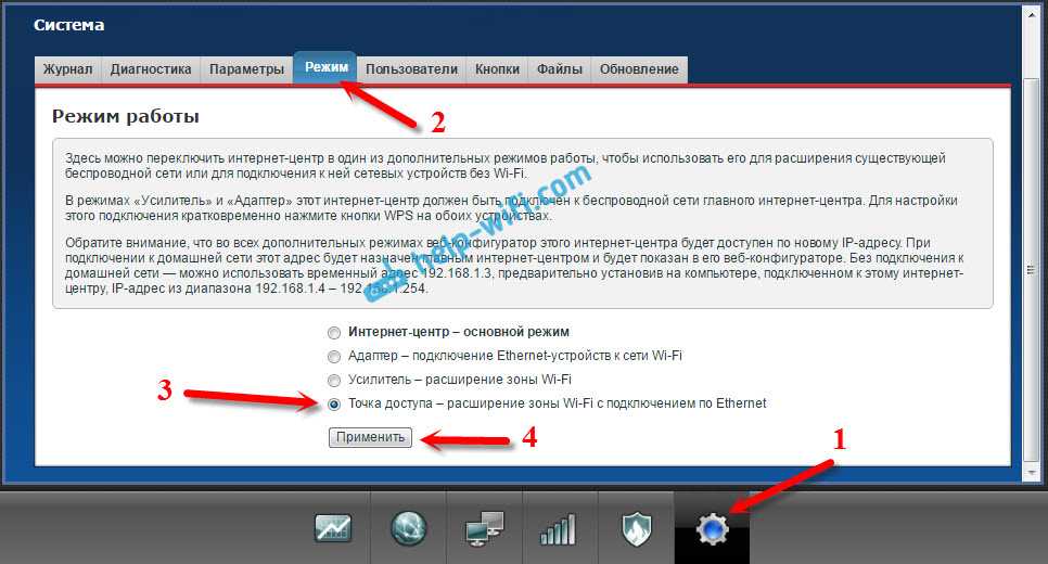 Для активации режима точки доступа на Zyxel, перейдите на вкладку «Система», и сверху откройте вкладку «Режим». Выделите пункт «Точка доступа – расширение зоны Wi-Fi с подключением по Ethernet», и нажмите кнопку «Применить».