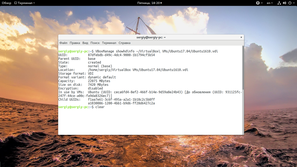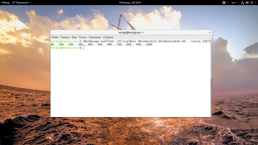 Для увеличения размера диска нужно использовать команду в терминале или в командной строке, в графическом интерфейсе такой функции, к сожалению, нет. Также вам нужно знать полный путь к вашему диску. Допустим, наш диск находится по адресу ~/VirtualBox\ VMs/Ubuntu17.04/Ubuntu1610.vdi в Linux. Давайте посмотрим информацию о нем, чтобы знать текущий размер: