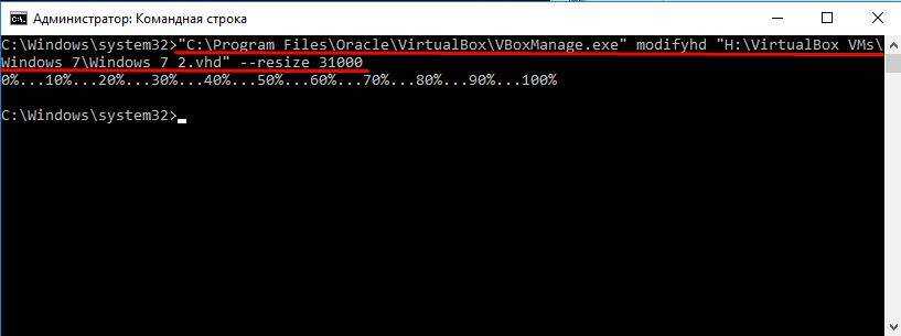 “C:Program FilesOracleVirtualBoxVBoxManage.exe” modifyhd “C:VM (VirtualBox)Win7-x64Win7-x64.vdi” –resize 25000