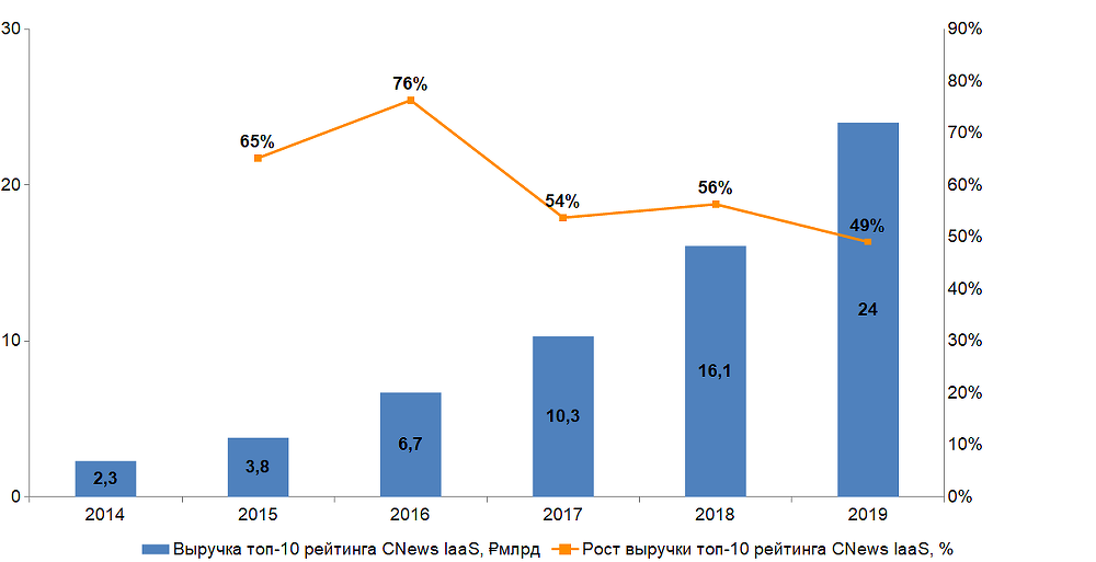 В 2019 г. выручка 10 крупнейших отечественных поставщиков «программного обеспечения как сервиса», SaaS, — достигла ₽48 млрд, увеличившись на 48% по сравнению с 2018 г. Оборот рынка IaaS, «инфраструктуры как сервиса в два раза меньше — выручка топ-10 участников рейтинга составила ₽24 млрд, однако и у них наблюдаются аналогичные темпы роста — 49%. При этом рост выручка 100 крупнейших ИТ-компаний России по итогам прошлого года увеличилась на 22%.