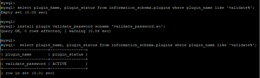 select plugin_name, plugin_status from information_schema.plugins where plugin_name like 'validate%'; install plugin validate_password soname 'validate_password.so';