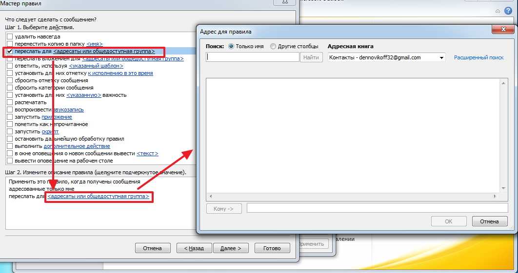 В следующем окне вам предстоит выбрать подходящие действие для нового правила. В нашем случае «Переслать для». После этого в нижней части списке кликните по соответствующей надписи, чтобы указать адреса, на которые будут пересылаться письма.