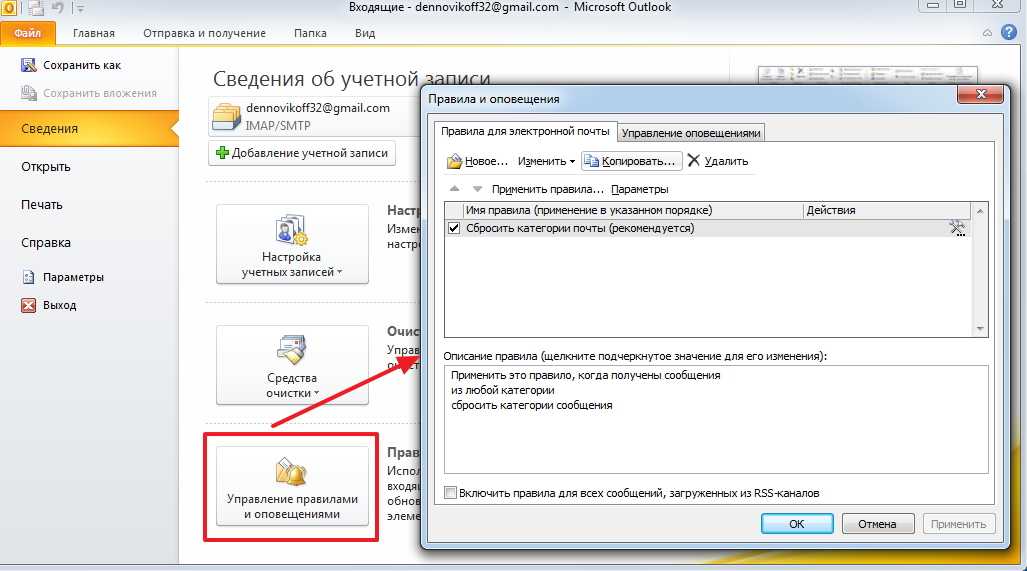 Когда вы закончите настраивать правило, нажмите кнопку Готово. Откроется диалоговое окно «Правила и предупреждения». Нажмите Применить, а затем нажмите ОК, чтобы активировать правило.