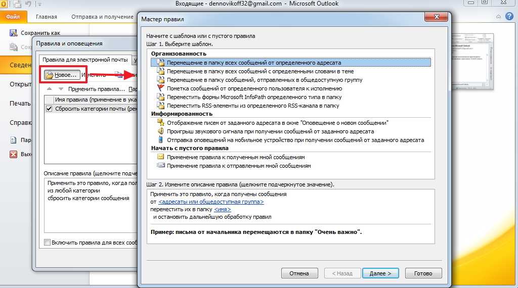 Выберите пункт меню «Новое правило» в левом верхнем углу диалогового окна. Мастер правил появляется: