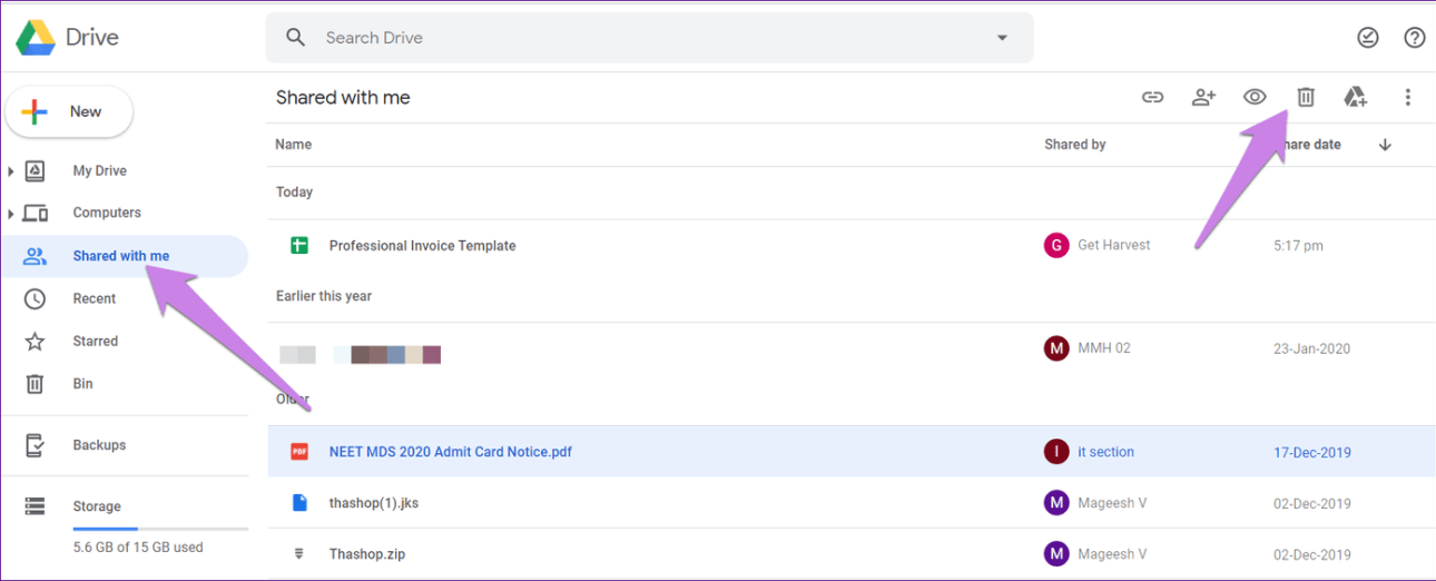 Чтобы удалить файлы, которыми с вами поделились, нажмите вкладку «Доступные мне» слева на Google Диске. Затем щелкните файл, который хотите удалить. Нажмите значок удаления вверху.