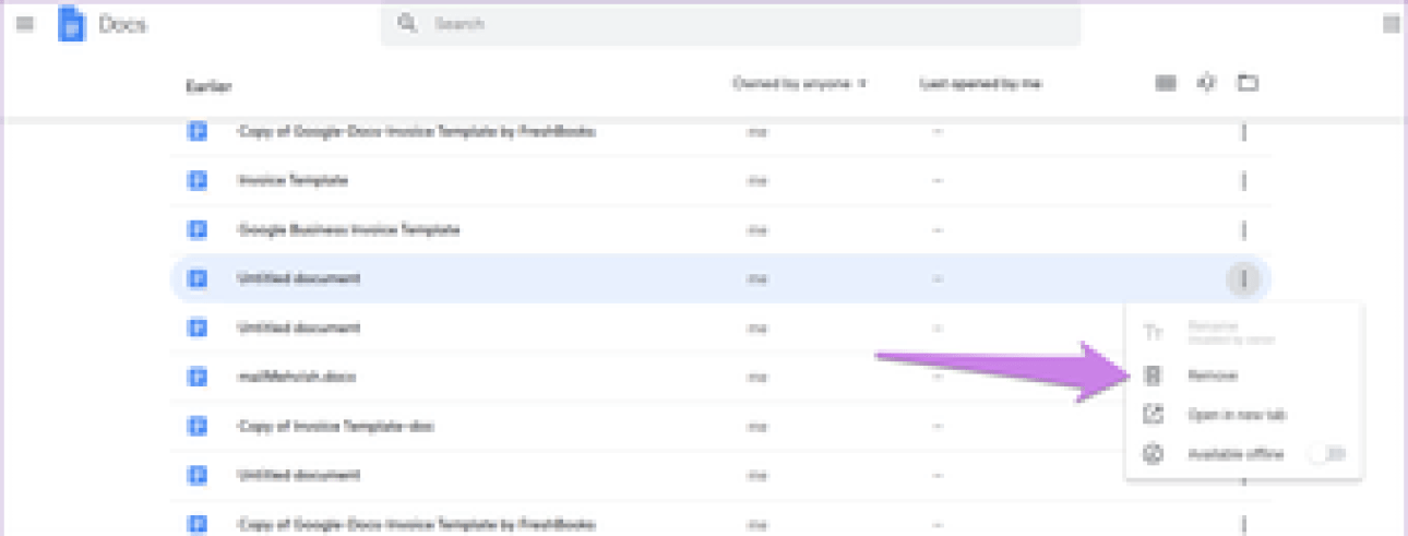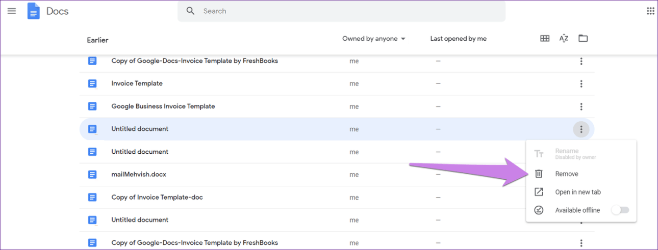 В случае с документами, таблицами и т. Д. Вы увидите значок с тремя точками на файлах. Щелкните по нему и выберите «Удалить».