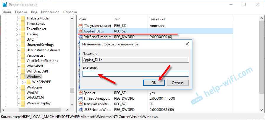 В окне слева будут разные параметры. Нас интересует параметр AppInit_DLLs. Нужно, чтобы значение этого параметра было пустым. Если у вас там что-то прописано, то двойным нажатием на параметр AppInit_DLLs открываем его, удаляем все из строки «Значение», и нажимаем Ok.