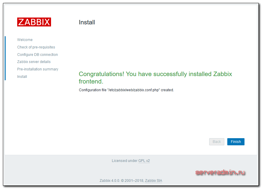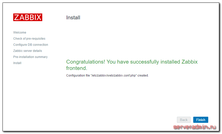 Если получили это сообщение, то поздравляю, установка сервера мониторинга Zabbix 3.2 закончена.