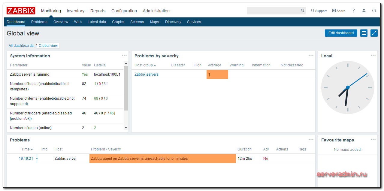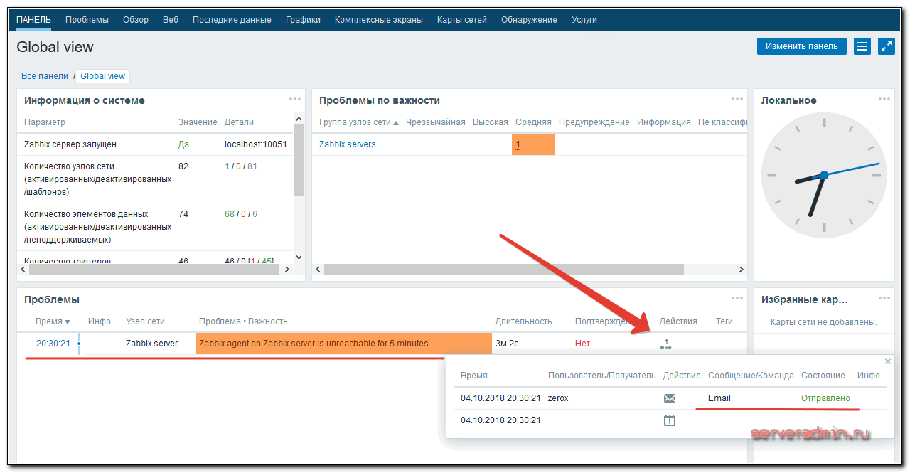 Ждем минимум 5 минут. Именно такой интервал указан по-умолчанию для срабатывания триггера на недоступность агента. После этого проверяем главную панель, виджет Проблемы.