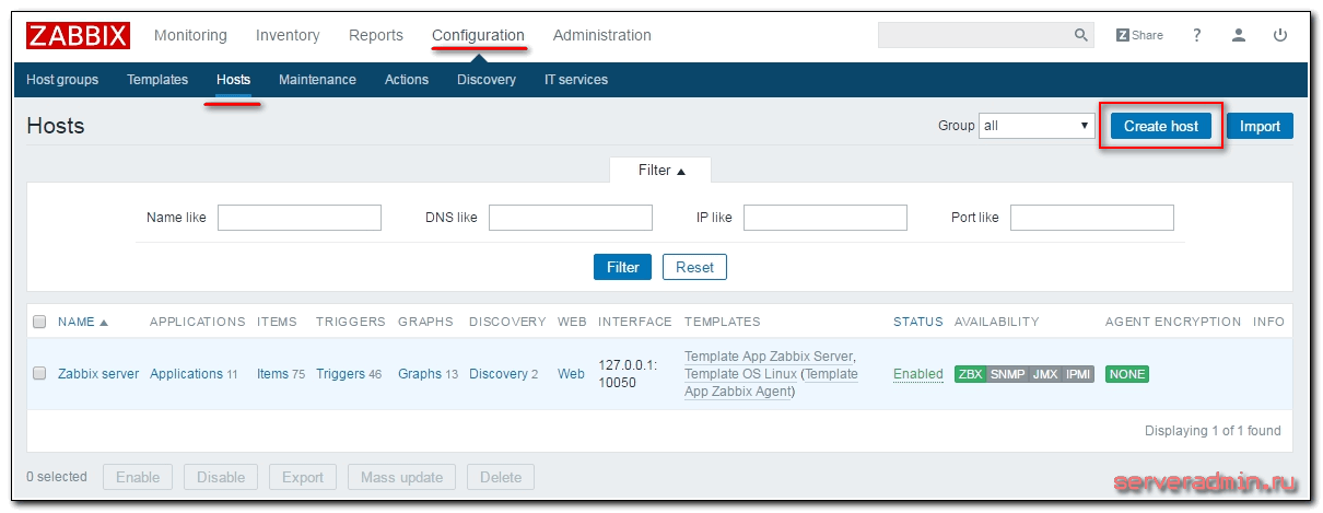 Чтобы работал мониторинг windows машины, нужно добавить на сервер мониторинга host с таким же hostname, что мы указали в конфиге агента. Для этого идем в web панель, открываем раздел Configuration -> Hosts и жмем Create host.