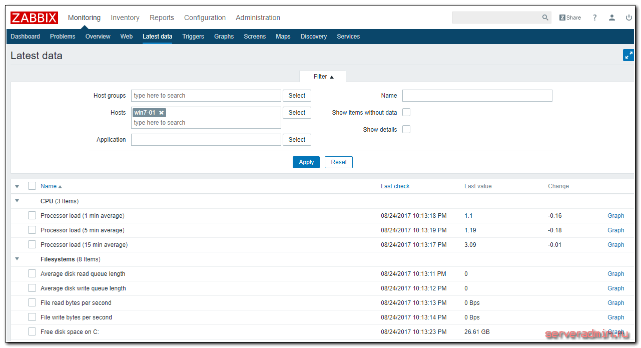 Все в порядке. Идем в веб интерфейс и проверяем поступление данных. Для этого идем в раздел Мониторинг -> Последние данные. Указываем в разделе Узлы сети Zabbix Server и ждем поступления первых данных. Они должны пойти через 2-3 минуты после запуска агента.