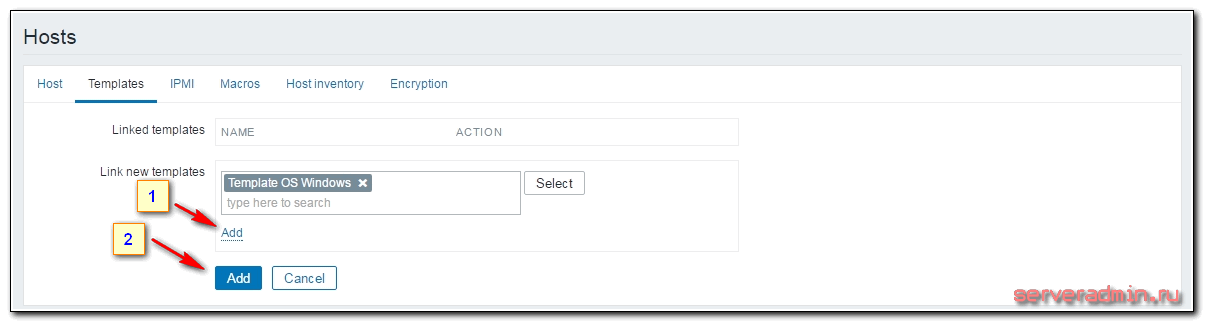 Потом переходим на вкладку Templates и нажимаем Select. Выбираем шаблон Template OS Windows и жмем маленькую ссылку add, затем большую.