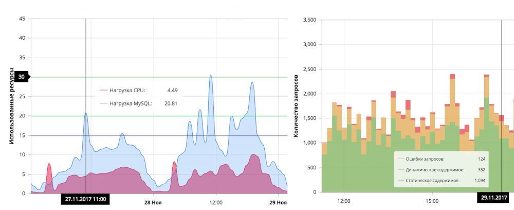Если на графике CPU и MySQL есть превышения, то часть запросов к сайтам отклоняется со статусом 503 (код ответа #5030). Чем больше превышения — тем больше ошибок на сайте. Снижение нагрузки или смена тарифа уменьшит количество ошибок.