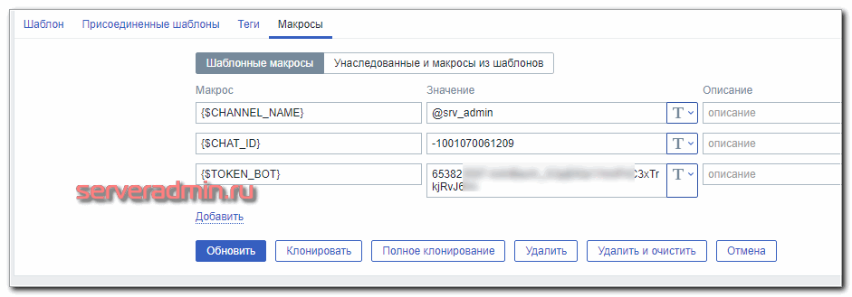 Добавляем в шаблон макросы для названий группы и канала, а так же токена бота.