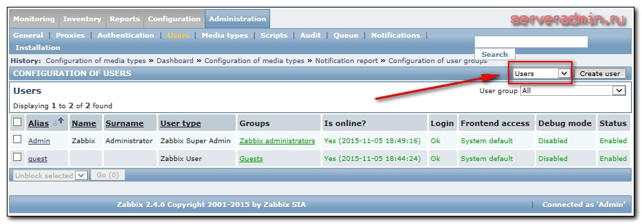 Сохраняем настройки, нажав Update. Дальше идем в раздел Administration -> Users. Меняем отображение с групп на пользователей: