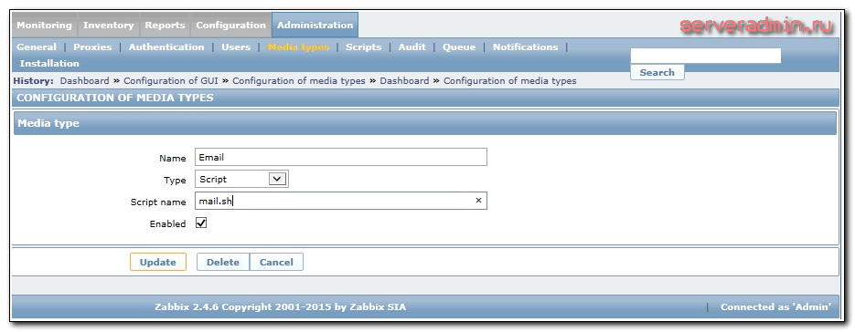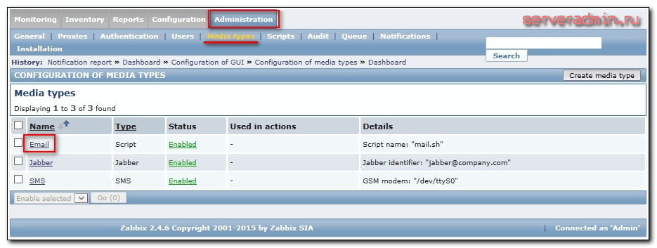 Нажимаем на пользователя Admin и переходим на вкладку Media, там жмем на add. Откроется окно добавления источника оповещений. Заполняем как на картинке: